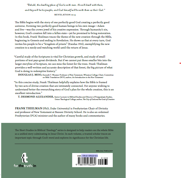 In this addition to the Short Studies in Biblical Theology series, Frank Thielman traces the theme of the new creation through Scripture, from God’s promise in Genesis to redeem the world to the culmination of this promise in the book of Revelation.